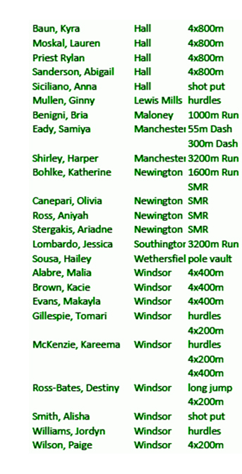 Southington – Giuliana Angieri, Riley Bassett, Emily Blankenship, Madeleine Canner-O’Mealy, Katherine Cavanaugh, Sara Fares, Shaelyn Flaherty, Jenna Hebert, Josephine Martin, Olivia Ostapowicz, Giada Pagnucco, Adriana Paszkowsk,i Gabriela Paszkowski, Emily Phipps, Martha Siwek