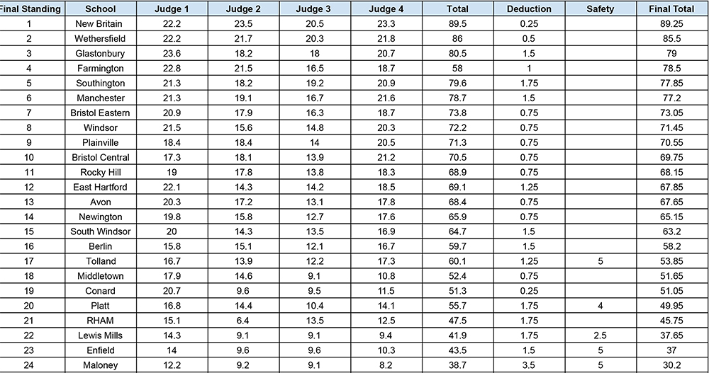 Overall Champion: SOUTHINGTON Division Champions: North – Wethersfield Central – Bristol Eastern South – Southington
